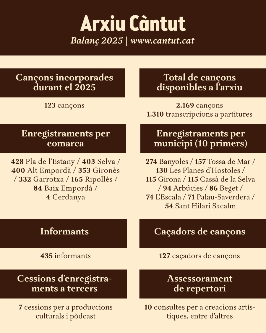 El projecte Càntut. Cançons de tradició oral presenta el balanç d'aquest 2025, un any en què l'arxiu audiovisual ha incorporat 123 nous enregistraments. D’aquesta manera, s’ha ampliat el fons documental i s’ha dut a terme la transcripció del text i la música de les noves cançons, així com d’alguns materials que han estat recollits anteriorment en altres cançoners. Un treball de camp que s’ha reforçat amb la recerca de documentació de cada enregistrament, per tal d’incloure diverses informacions referents a la procedència i a la identitat dels cantadors.