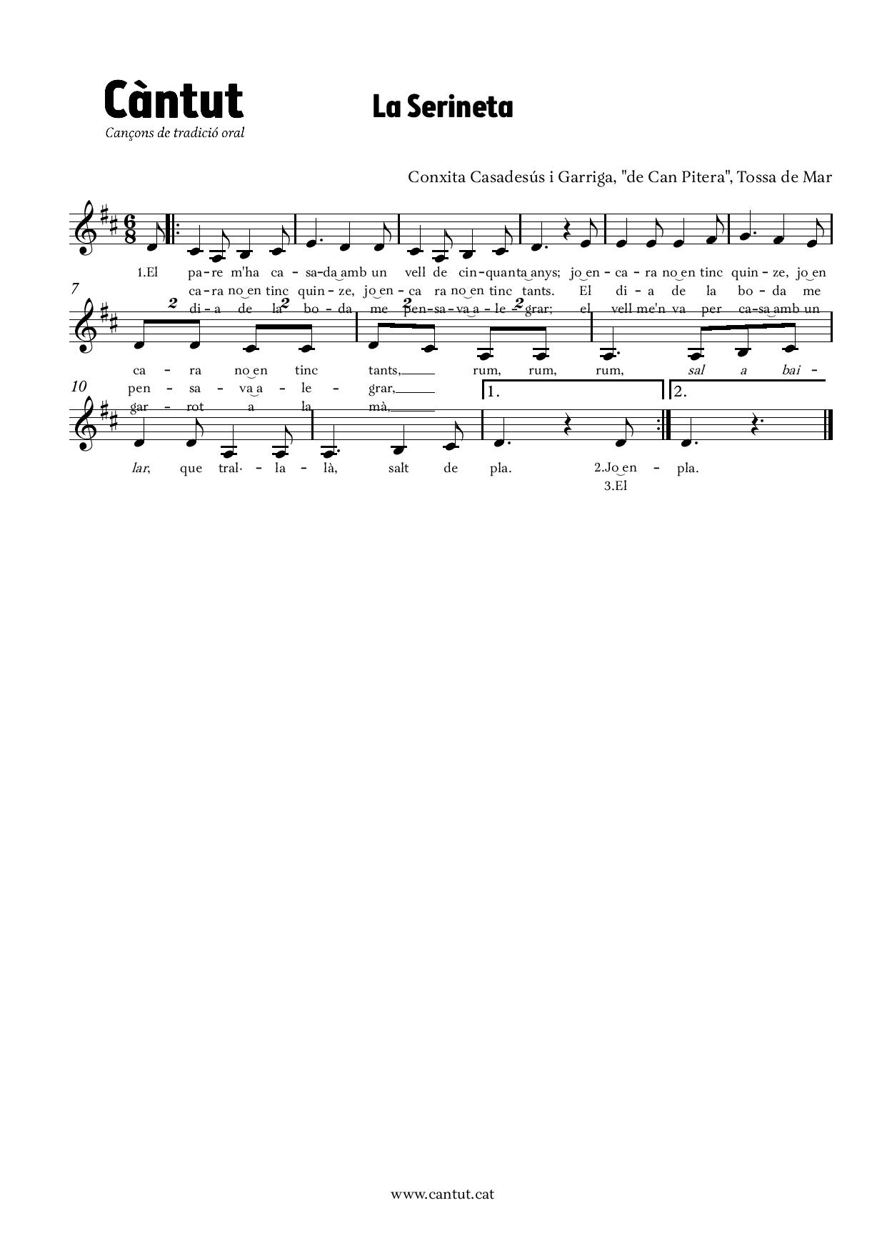 —T'afigures? La Serineta! Quants anys deu fer que no sentim ni cantem la Serineta? I dèieu que vós la sabíeu? —No dic que la sabés: encara la sé, ves! Vull veure si la lletra i la música que jo vaig aprendre són fidels a la vostra cançó.