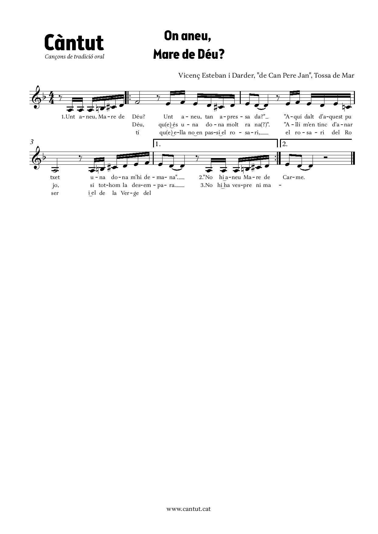 -Al Fons de Música Tradicional, recollida com a "On aneu Mare de Déu" a Gisclareny (Berguedà) l'any 1923.